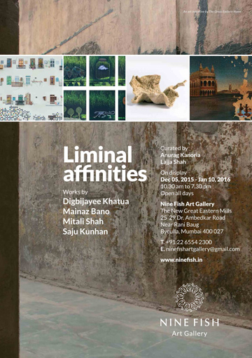 Through nuanced, aesthetic evocations that include paintings on canvas and wood, sculptural installations and works on paper, Liminal affinities seeks to portray contemporary urgencies that inform our lived experiences within a complexand rapidly transforming urban milieu.